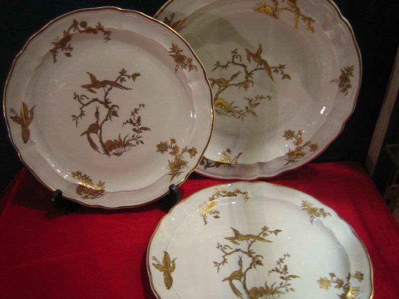 | 22 assiettes plates, 11 dessert, 12 creuses,1 coupe sur talon, 2 raviers,1 grand plat oval ... |