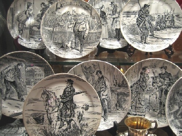 12 assiettes 2 présentant des accidents mineurs.Un bel ensemble traité en grisaille ... |