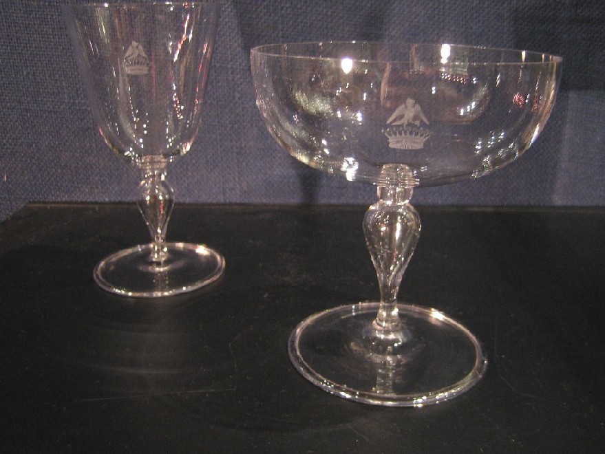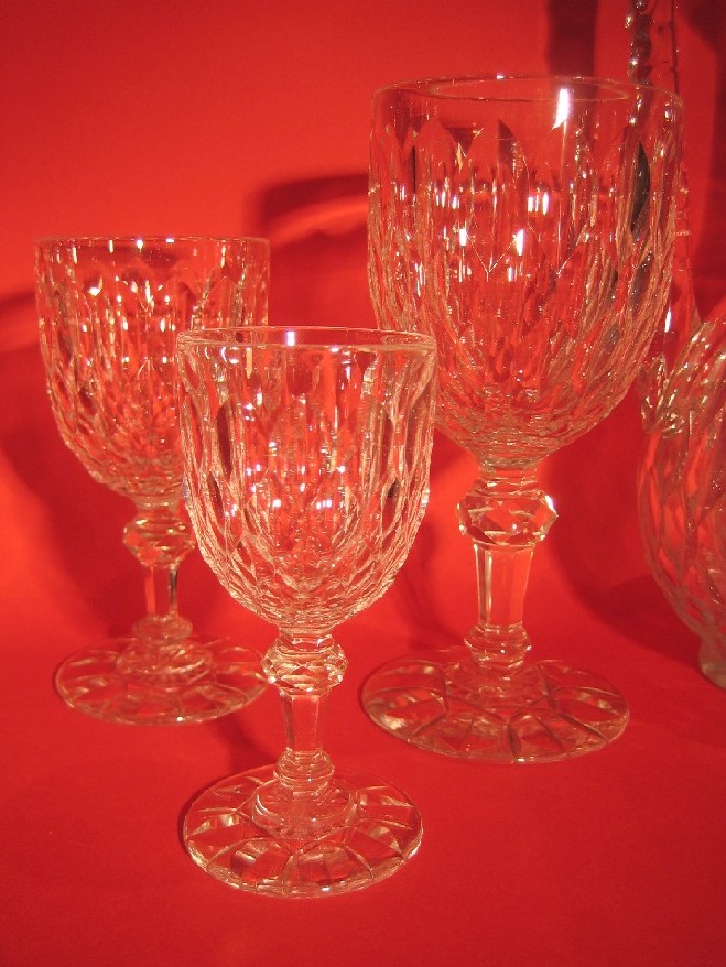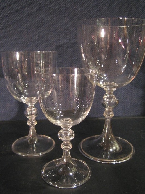 Quelques coupes, 10 verres à vin rouge, 10 à vin blanc.Chaque verre s'orne d'une couronn ... |