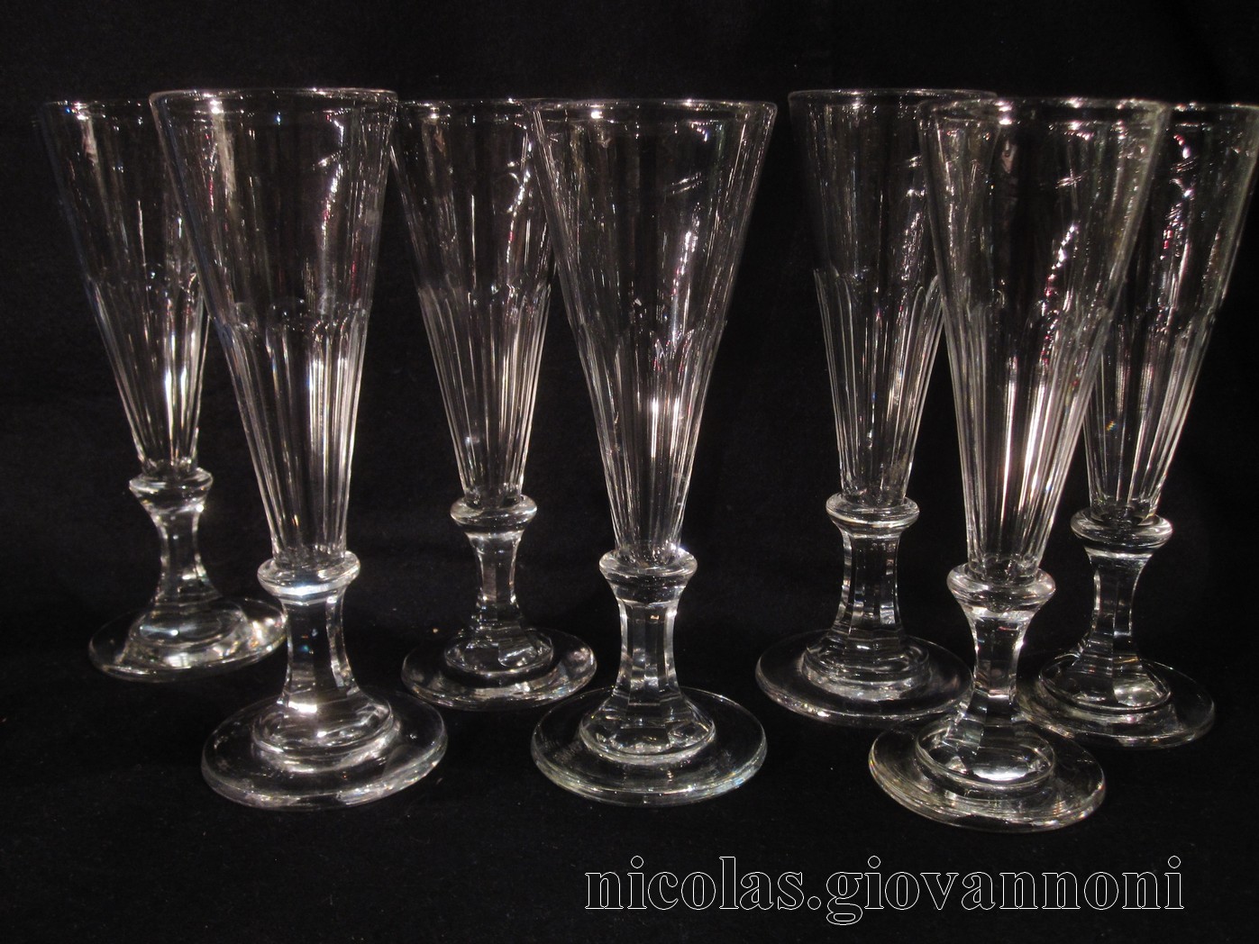 14 flutes en cristal de la fin du 19ème. La jambe est joliment taillée en cotes plates c ... |