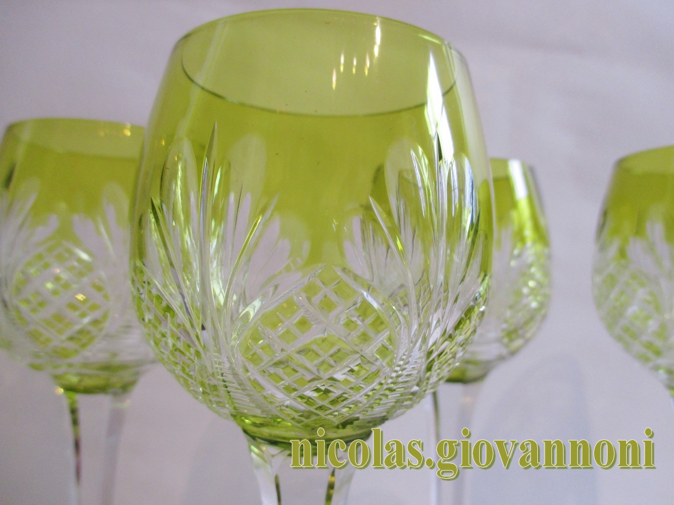 SAINT LOUIS - Cristal Vert mousseline.taillé - 6 verres à vin du Rhin. 1910 | |