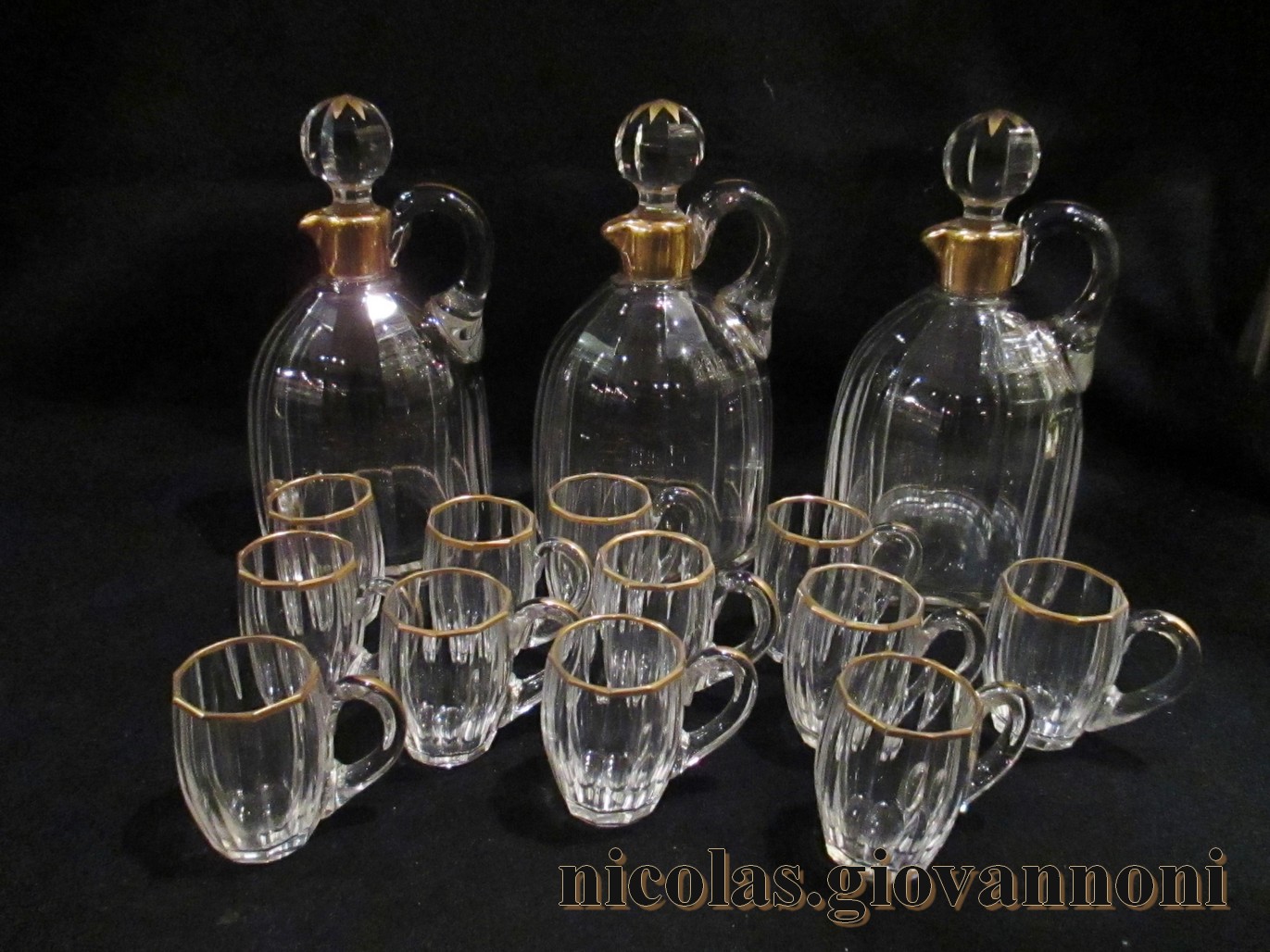 3 jolis carafons accompagnent 12 verres à anses en cristal taillé de cotes plates, orné ... |