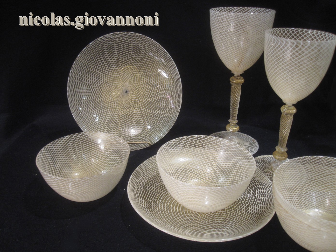 MURANO - A Reticello - 8 bols, assiettes, 4 verres.1950 | |