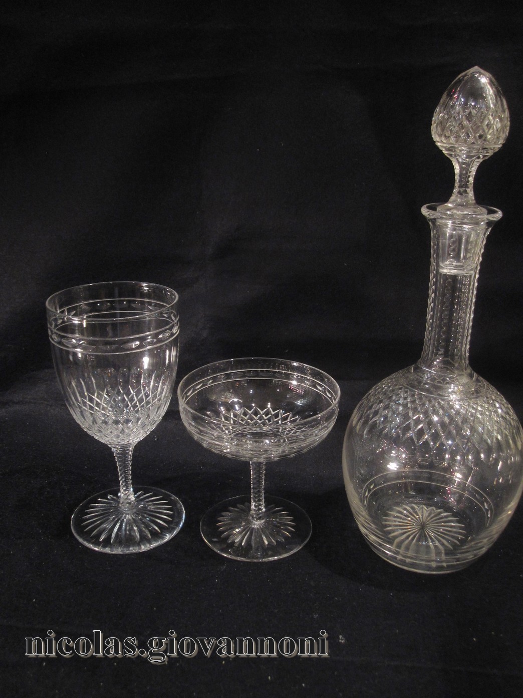 BACCARAT - Diamants carrés.1895 - 9 verres à eau, 12 coupes, carafes | |