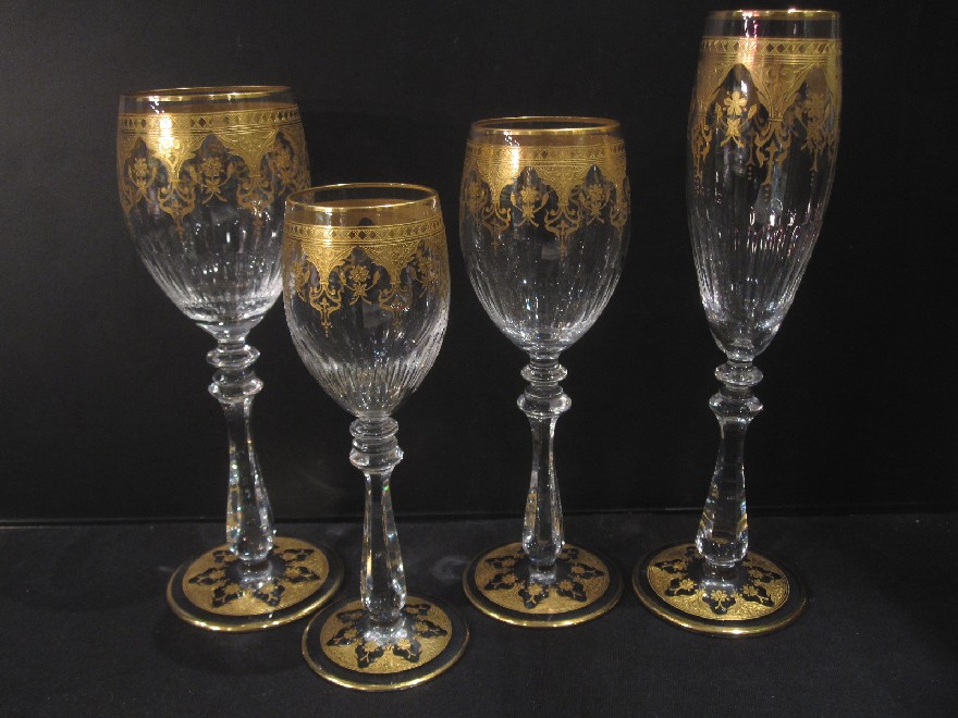 14 verres à eau, 15 à vin, 15 vin blanc, 13 flutes. 1 jatte à caviar ... |
