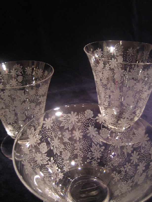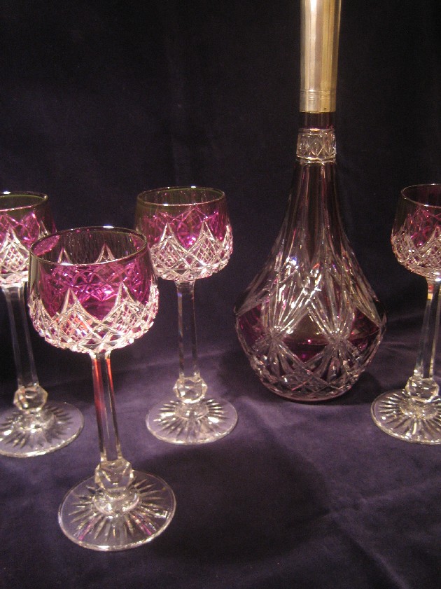 12 verres, 2 immenses carafes, le col gainé d'un fourreau en argent.L'ensemble en couleur ... |