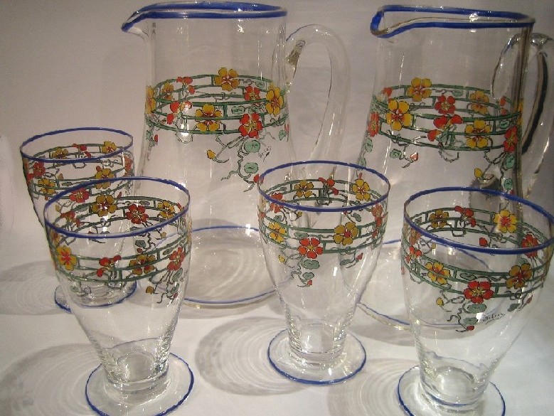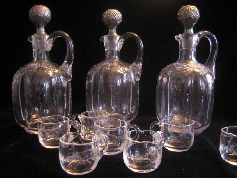 3 carafes au bouchon en argent dominent 10 charmant verres, en cristal quadrilobé, en for ... |